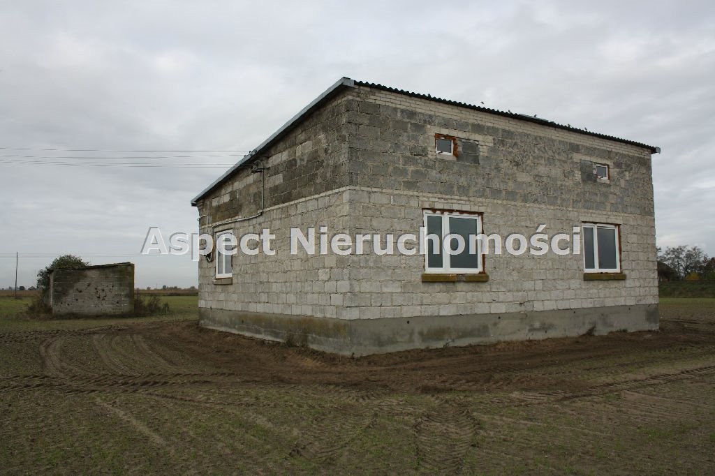 Prąd doprowadzony do budynku, woda z sieci około 100m, okna PCV, dach kryty eternitem. Dom w stanie surowym zamkniętym.